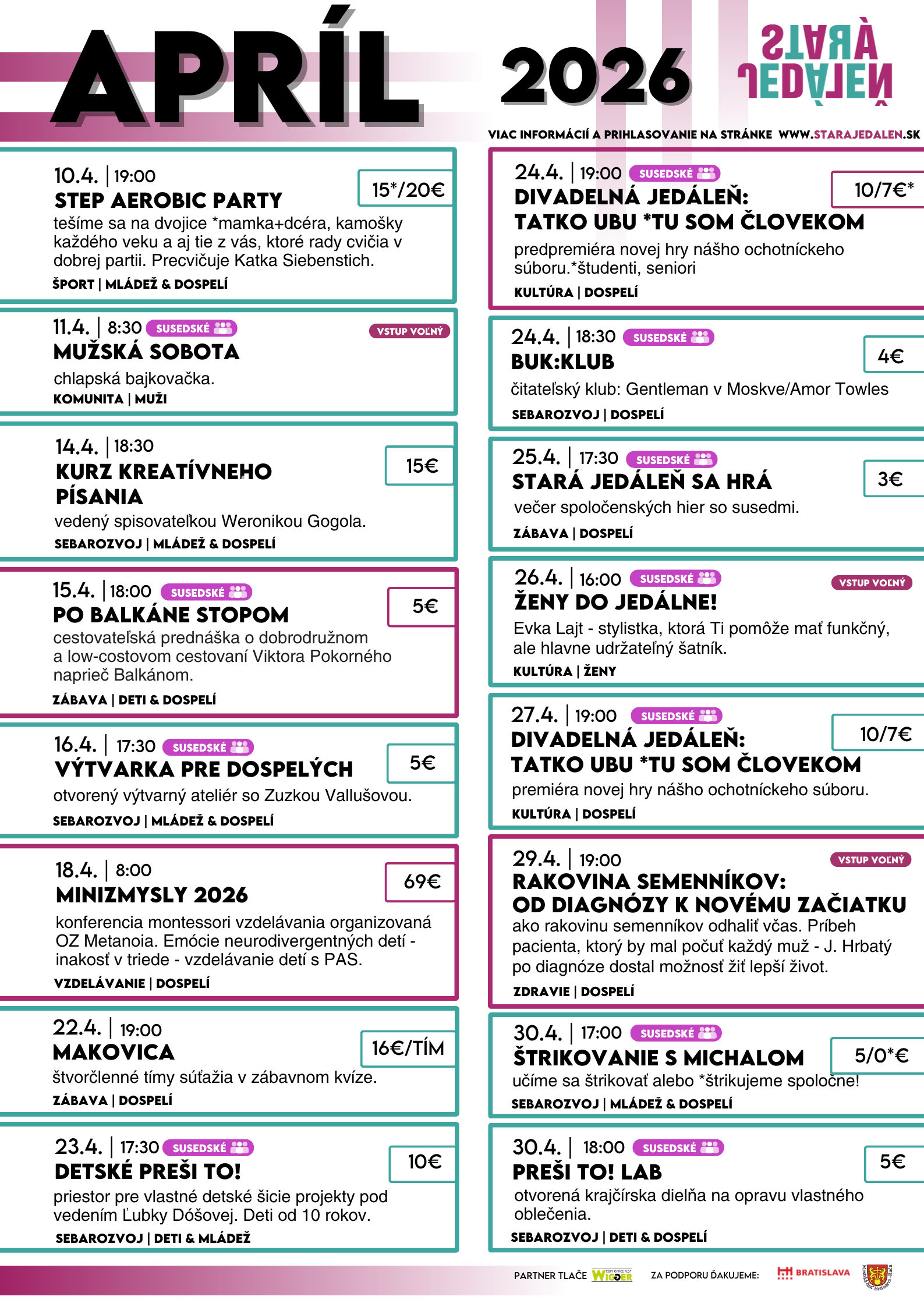 VERNISÁŽ VÝSTAVY OBLUDÁRIUM 09.03.2026 18:00 Viac informácií STARÁ JEDÁLEŇ SA HRÁ 25.04.2026 17:30 Viac informácií ŽENY DO JEDÁLNE s Natáliou Vargovou 26.04.2026 16:00 Viac informácií TATKO UBU * Tu môžem byť človekom 27.04.2026 19:00 Viac informácií Rakovina Semenníkov 29.04.2026 19:00 Viac informácií SUSEDSKÉ ŠTRIKOVANIE S MICHALOM 30.04.2026 17:00 Viac informácií PREŠI TO! LAB 30.04.2026 18:00 Viac informácií MEDZI NEHOU A ŽENOU 01.05.2026 09:00 Viac informácií VÝTVARKA PRE DOSPELÝCH 07.05.2026 17:30 Viac informácií KAMAMUTA 13.05.2026 19:00 Viac informácií DETSKÉ PREŠI TO! 14.05.2026 17:30 Viac informácií KREATÍVNE PÍSANIE 14.05.2026 18:30 Viac informácií MUŽSKÁ SOBOTA 16.05.2026 08:30 Viac informácií ZÁBAVNÝ VEDOMOSTNÝ KVÍZ MAKOVICA 18.05.2026 19:00 Viac informácií HPV FAKTY A MÝTY 21.05.2026 18:00 Viac informácií Masterclass AI s Milošem a Sentou 22.05.2026 11:00 Viac informácií SWAP A HAPPY HOUR 22. - 23. 5 2026 22.05.2026 17:00 Viac informácií SWAP RASTLÍN + PORADŇA 25.05.2026 17:00 Viac informácií SUSEDSKÉ ŠTRIKOVANIE S MICHALOM 28.05.2026 17:00 Viac informácií PREŠI TO! LAB 28.05.2026 18:00 Viac informácií BUK:KLUB 29.05.2026 18:30 Viac informácií KOMUNITNÝ DEŇ S AMOSÁKMI 30.05.2026 09:00 Viac informácií STARÁ JEDÁLEŇ SA HRÁ 30.05.2026 17:30 Viac informácií STEP AEROBIC PARTY 30.05.2026 19:00 Viac informácií ŽENY DO JEDÁLNE s Jankou Lučeničovou 31.05.2026 16:00 Viac informácií