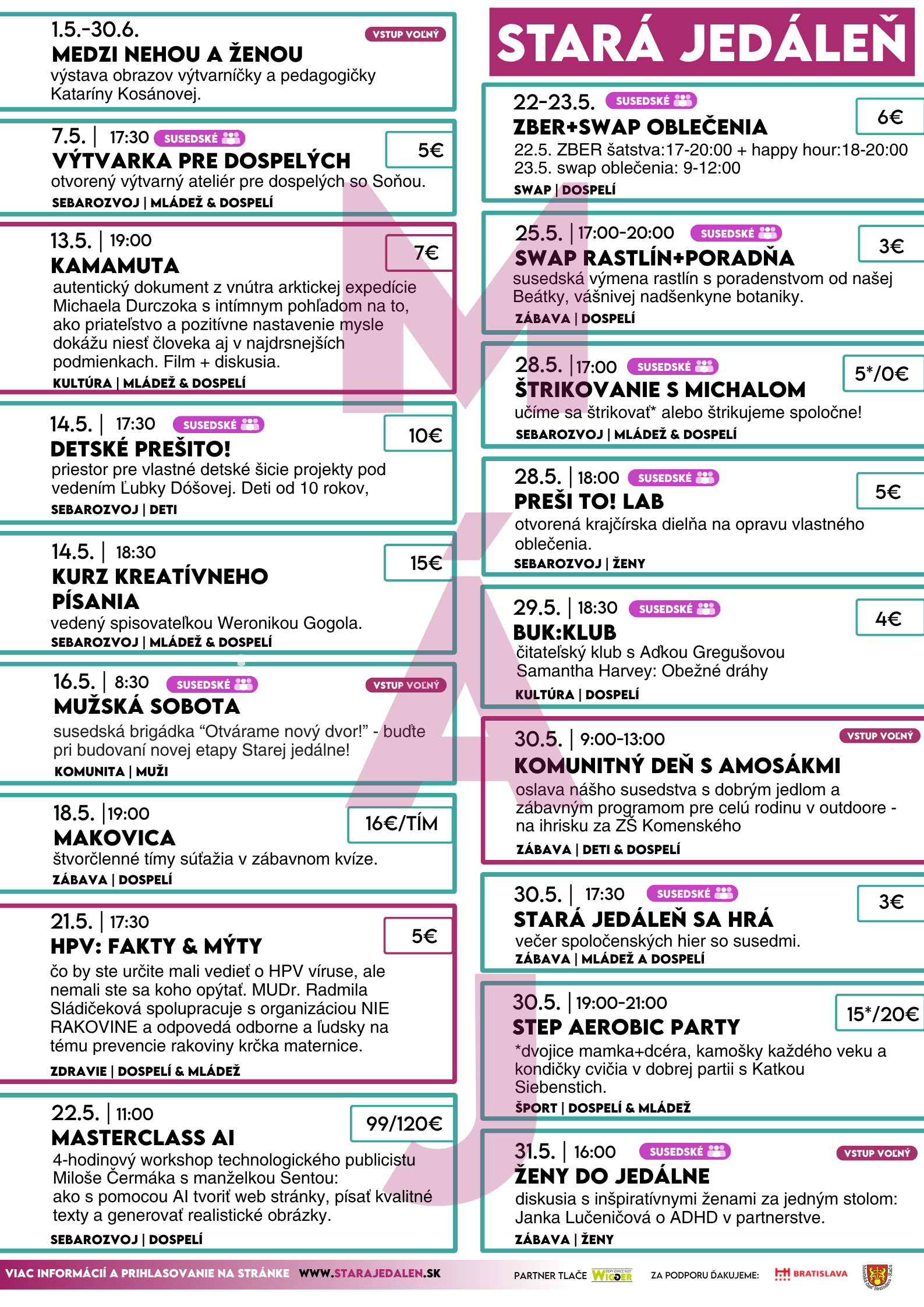 VERNISÁŽ VÝSTAVY OBLUDÁRIUM 09.03.2026 18:00 Viac informácií Rakovina Semenníkov 29.04.2026 19:00 Viac informácií SUSEDSKÉ ŠTRIKOVANIE S MICHALOM 30.04.2026 17:00 Viac informácií PREŠI TO! LAB 30.04.2026 18:00 Viac informácií MEDZI NEHOU A ŽENOU 01.05.2026 09:00 Viac informácií VÝTVARKA PRE DOSPELÝCH 07.05.2026 17:30 Viac informácií KAMAMUTA 13.05.2026 19:00 Viac informácií DETSKÉ PREŠI TO! 14.05.2026 17:30 Viac informácií KREATÍVNE PÍSANIE 14.05.2026 18:30 Viac informácií MUŽSKÁ SOBOTA 16.05.2026 08:30 Viac informácií ZÁBAVNÝ VEDOMOSTNÝ KVÍZ MAKOVICA 18.05.2026 19:00 Viac informácií HPV FAKTY A MÝTY 21.05.2026 18:00 Viac informácií Masterclass AI s Milošem a Sentou 22.05.2026 11:00 Viac informácií SWAP A HAPPY HOUR 22. - 23. 5 2026 22.05.2026 17:00 Viac informácií SWAP RASTLÍN + PORADŇA 25.05.2026 17:00 Viac informácií SUSEDSKÉ ŠTRIKOVANIE S MICHALOM 28.05.2026 17:00 Viac informácií PREŠI TO! LAB 28.05.2026 18:00 Viac informácií BUK:KLUB 29.05.2026 18:30 Viac informácií KOMUNITNÝ DEŇ S AMOSÁKMI 30.05.2026 09:00 Viac informácií STARÁ JEDÁLEŇ SA HRÁ 30.05.2026 17:30 Viac informácií STEP AEROBIC PARTY 30.05.2026 19:00 Viac informácií ŽENY DO JEDÁLNE s Jankou Lučeničovou 31.05.2026 16:00 Viac informácií